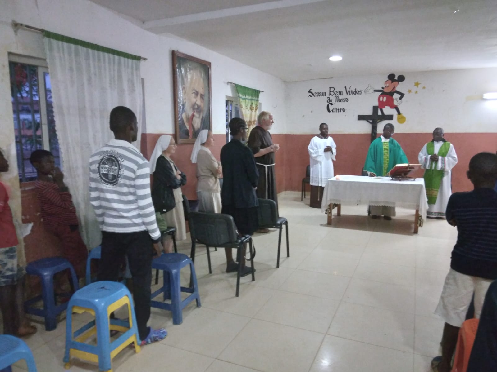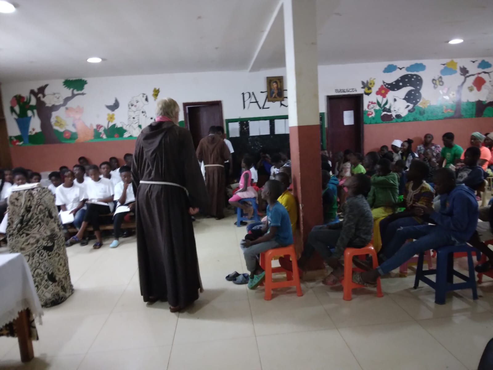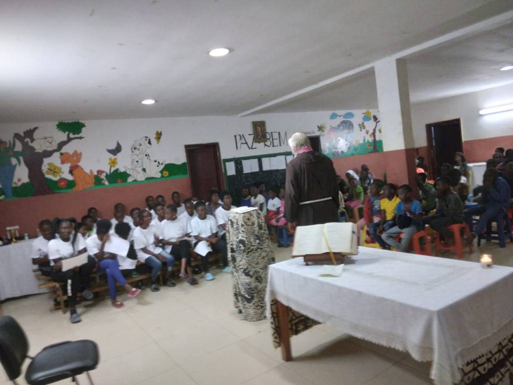 Una celebrazione che unisce la gratitudine ed il benvenuto. I ragazzini, gli educatori e le Suore MFVI del Centro Frei Giorgio Zulianello (Angola) si uniscono per rendere grazie a Fra Afonso che cambierà comunità e missione e per ricevere fra Estevão.