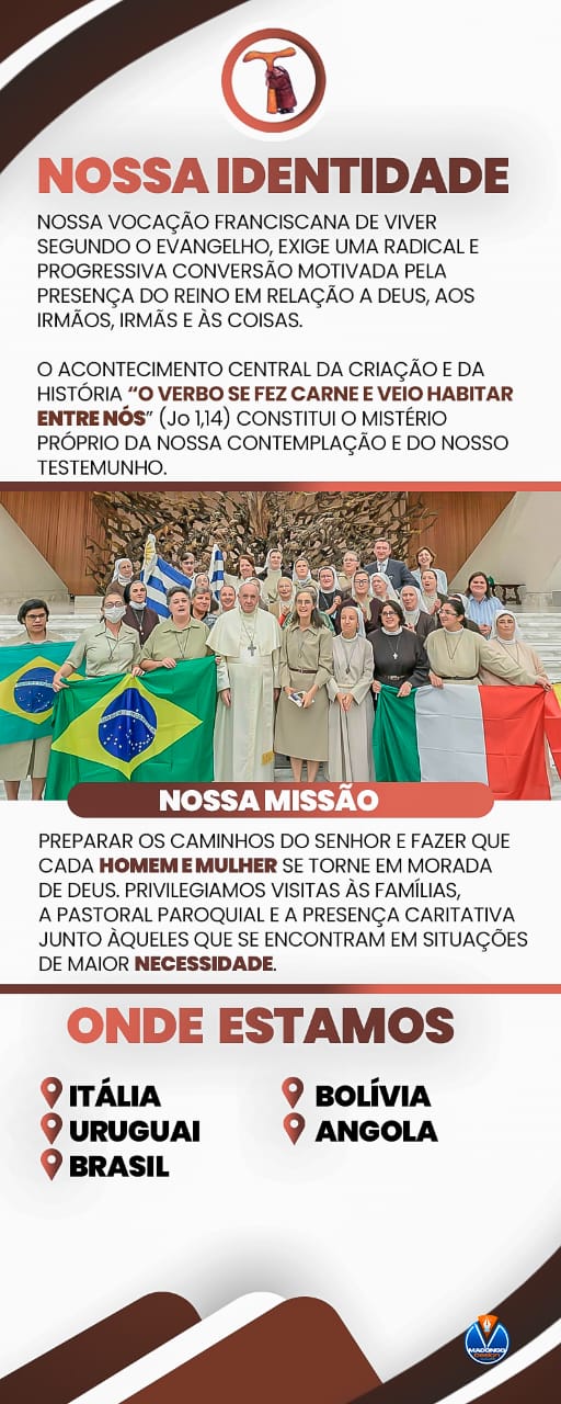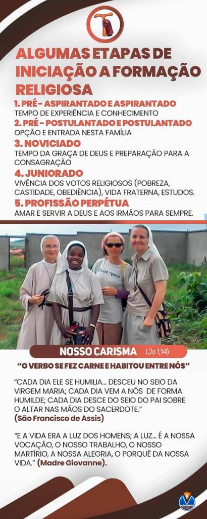 Un piccolo passo ma molto significativo. Per fare conoscere aspetti del nostro Carisma abbiamo preparato 3 “cartelloni” in portoghese. Più concretamente essi sono sulla nostra identità di Suore Missionarie Francescane del Verbo Incarnato, sulla fondazione del nostro Istituto (1930, in Italia) e sulle tappe formative che guidano la nostra crescita integrale.