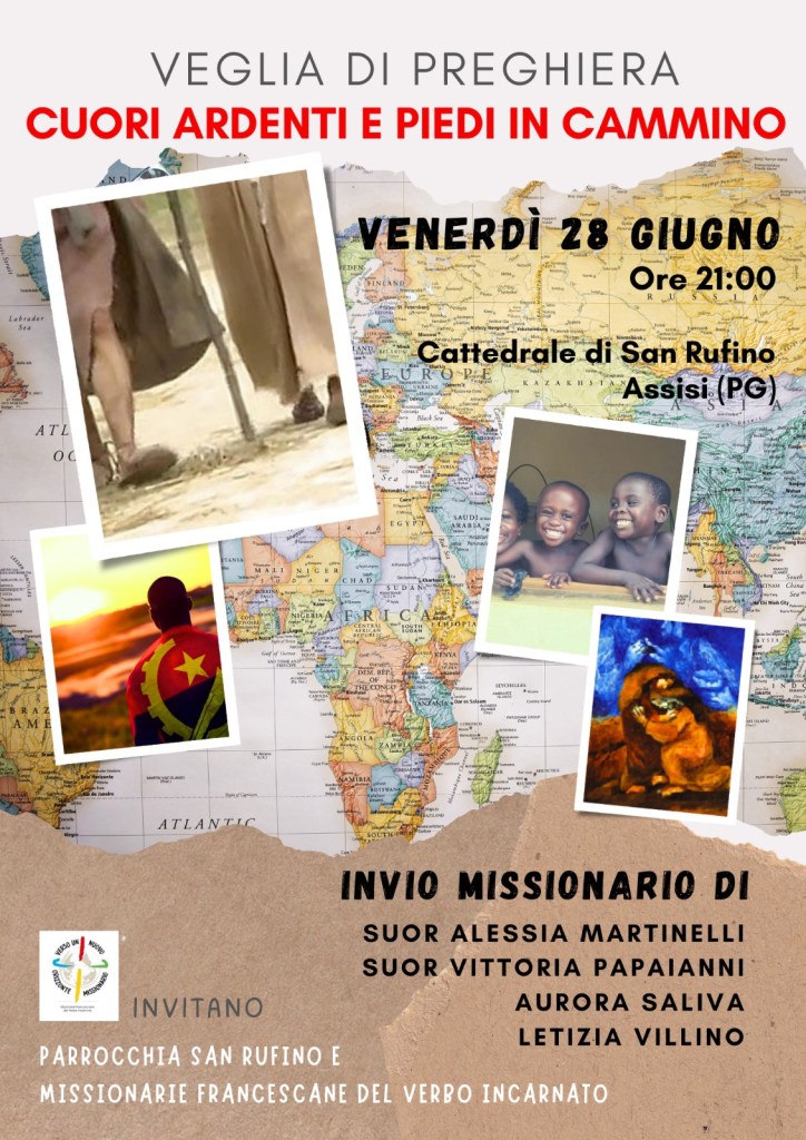 In questa veglia di preghiera abbiamo celebrato insieme la chiamata missionaria ed oggi in particolare, l’invio di sr Alessia Martinelli e sr Vittoria Papaianni, Missionarie Francescane del Verbo Incarnato che tra pochi giorni partiranno per Angola e di Aurora e Letizia che faranno parte della missione Estiva giovanile a M’Banza Congo, Angola.